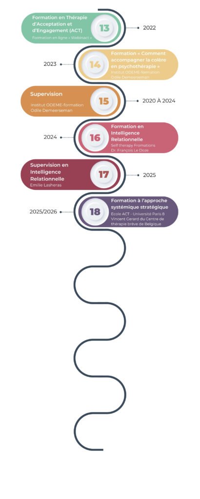 Après avoir exploré les thérapies cognitives et comportementales, la communication non violente, les thérapies psycho-corporelles, la pleine conscience, le psychotraumatisme et son impact sur la régulation du système nerveux, la théorie polyvagale et j’en passe, mon parcours m’amène aujourd’hui à utiliser de manière privilégiée l’approche systémique stratégique pour des raisons très concrètes : son efficacité, sa simplicité, son caractère profondément respectueux de la personne, son histoire, son rythme et sa problématique, et enfin son coté pragmatique ramenant dans l’ici et maintenant. J’ai également exploré en profondeur l’univers du psychotraumatisme et de ses répercussions sur le fonctionnement d’un individu, ceci faisant de moi une professionnelle trauma-informée.